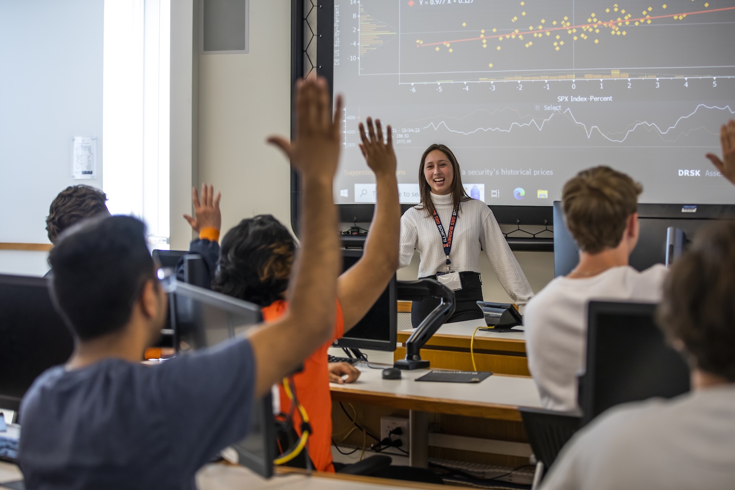 The lab has access to a Data Science and Deep Learning workstation, which advances and promotes FinTech research, and includes three separate spaces: a 48-seat primary instruction room equipped with 24 high-end workstations with dual screens, a secondary lab equipped with 20 workstations and live financial data, and a walk-up area with 8 dual screen workstations that are monitored by instructional aides.