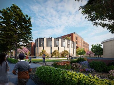 Steven S. Wymer Hall will include a 200-seat auditorium, two 80-seat classrooms, and four 60-seat classrooms. In support of the College’s online programs, the new building will include two 40’x40’ sound stages, five studios, and six control booths – all of which will be shared spaces with schools and colleges on south campus. Eighteen additional meeting and collaborative rooms will provide expanded space for experiential learning, group work, and meetings with recruiters. Finally, 84 new office spaces will support the College’s growing faculty and staff.
